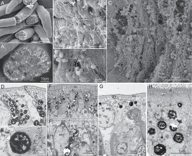 通过显微镜观察,科学家发现蠕虫的上皮细胞中充满了直径0.77-1.29微米的黄色颗粒。这些颗粒不仅存在于体表,还分布在鳃、口触手和消化道中——所有与海水直接接触的部位。