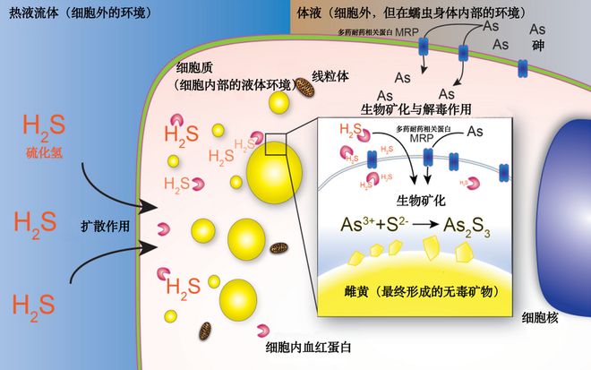 至此,两种致命的毒物在“与世隔绝”的囊泡“反应仓”内相遇了。在这个由双层脂质膜包裹的封闭空间里,环境被细胞精确调控:这里是还原性的、低温的,且pH值接近中性。这些条件恰好是促进砷和硫化氢发生化学反应,形成稳定、不溶于水的雌黄晶体的最佳环境。于是,两种液态的、高活性、高毒性的物质,就此结合成了一种固态的、惰性的、相对无害的矿物。毒性被永久地“锁定”在了晶体结构中。